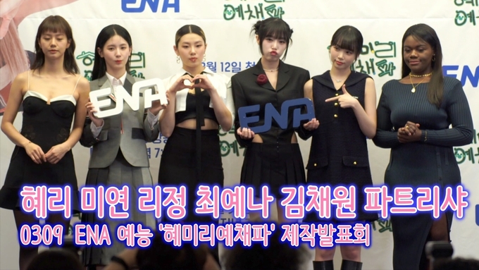 [뉴스인스타 양철수기자] 3월 9일(목) 오후, 서울시 마포구 상암동 스탠포드호텔에서 열린 ENA 예능프로그램 '혜미리예채파' 제작발표회에 혜리, 미연, 리정, 최예나, 김채원, 파트리샤가 참석해 포즈를 취하고 있다.