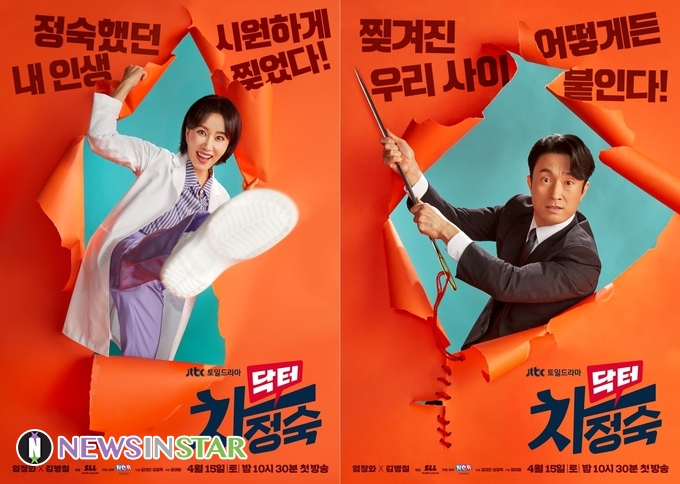 오는 4월 15일 첫 방송되는 JTBC 새 토일드라마 ‘닥터 차정숙’(연출 김대진·김정욱, 극본 정여랑, 제작 ㈜스튜디오앤뉴) 측은 28일, 짜릿한 반란을 시작한 차정숙(엄정화 분)과 인생 격변을 맞은 서인호(김병철 분)의 극과 극 캐릭터 포스터를 공개했다. ‘찢으면 붙인다’는 상반된 전법이 20년차 부부에게 날아든 변화를 더욱 궁금하게 한다.