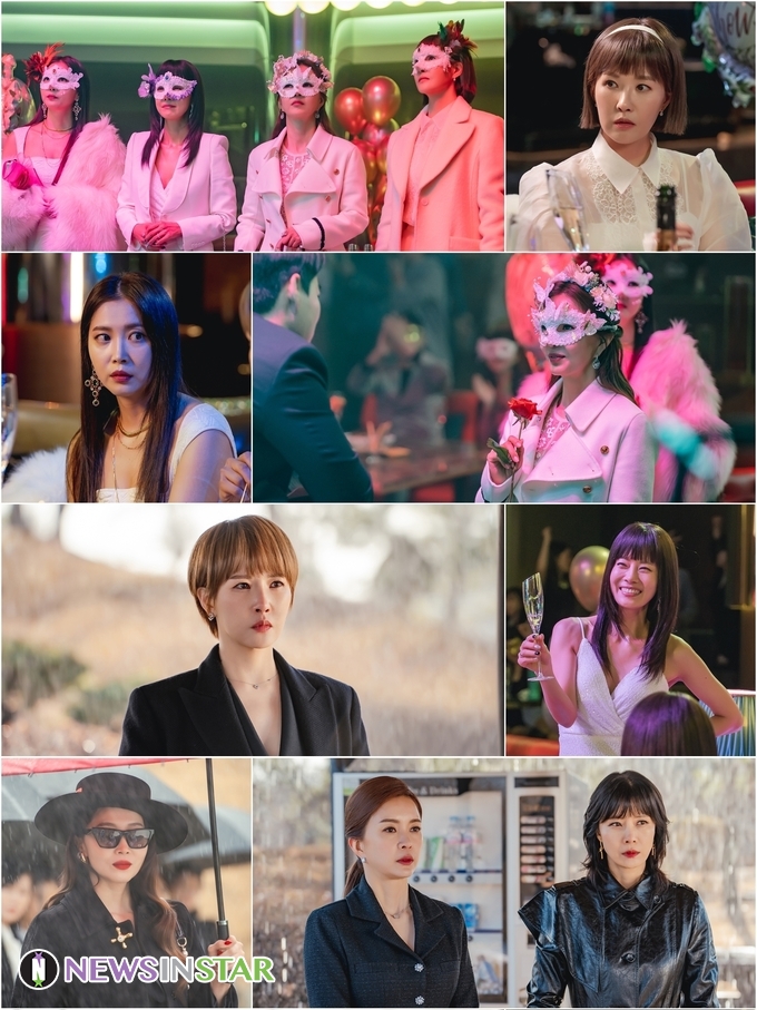 개성 만점 파티룩으로 드레스 업한 재이(김선아 분), 유나(오윤아 분), 유정(신은정 분), 해미(유선 분)는 가면무도회를 연상시키는 가면으로 얼굴을 가린 채 브라이덜 샤워 파티를 즐기고 있다.