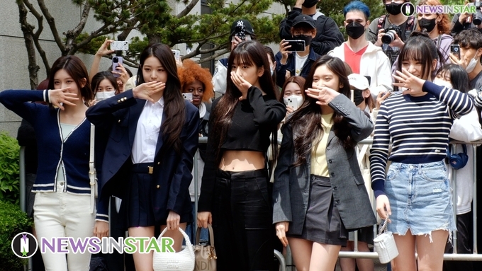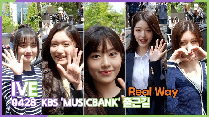[뉴스인스타 양철수기자] 4월28일(금) 오전, 서울시 영등포구 여의도 KBS 공개홀에서 생방송으로 진행되는 KBS '뮤직뱅크' 리허설에 참석하기 위해 그룹 IVE(아이브) 가을, 원영, 리즈, 이서가 방송국에 도착해 포즈를 취하고 있다.