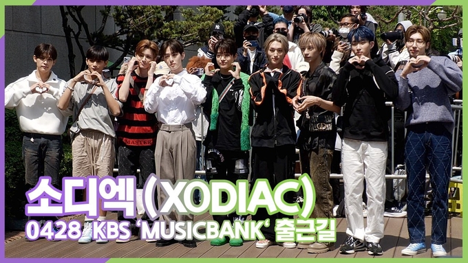 [케이팝인스타 양철수기자] 4월 28일(금) 오전, 서울시 영등포구 여의도 KBS 신관 공개홀에서 열린 KBS '뮤직뱅크' 생방송에 참석하기 위해 그룹 소디엑(XODIAC) 렉스, 현식, 범수, 웨인, 씽, 다빈, 자얀, 규민, 리오가 방송국에 도착해 포즈를 취하고 있다.
