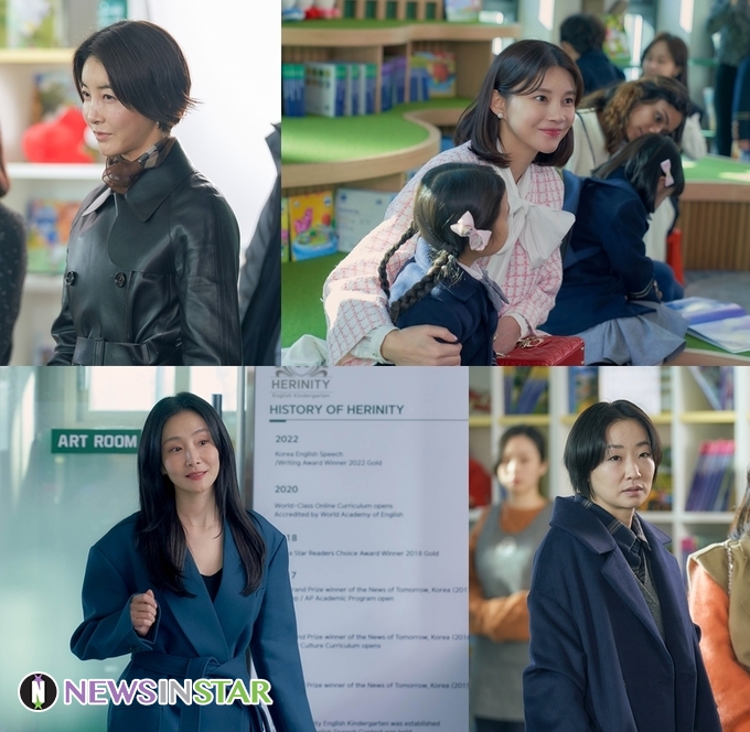 먼저 남다른 카리스마와 포스를 내뿜고 있는 송정아(진서연 분)가 눈길을 끈다. 뷰티 기능 식품 업체 ‘이너스피릿’의 설립자이자 대표이사인 송정아는 헤리니티 내에서도 엄마들의 대표를 담당하는 권력자다. 사진에서도 일인자 특유의 여유로움이 느껴지는 가운데, 자신의 힘과 권력을 뺏기지 않기 위해 더욱 노력하는 그녀의 싸움이 기대된다.
