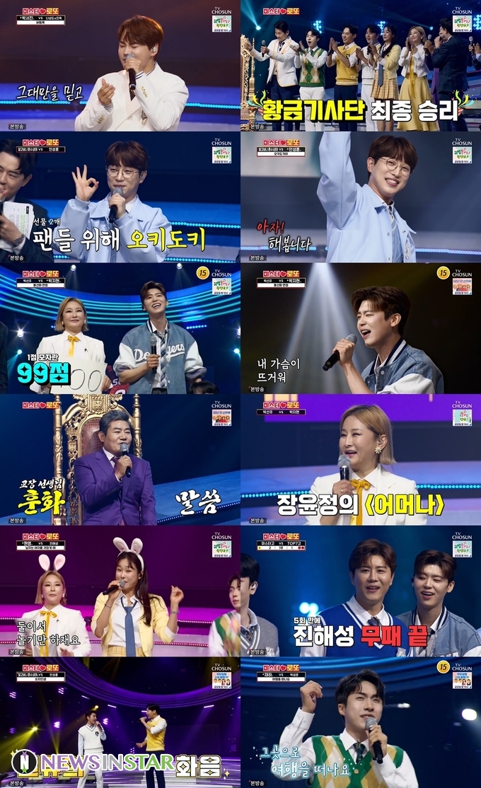 이날 방송은 ‘계급장떼고’ 특집으로 진행됐다. 이에 ‘미스터트롯2’ 경연 당시 TOP7의 마음을 조마조마하게 했던 마스터 군단 박선주, 알고보니 혼수상태(김지환, 김경범), 현영이 황금기사단의 특급 용병으로 출격해 TOP7과 노래대결을 펼쳤다. 또 마스터 군단 대부 진성이 함께해 역대급 귀호강 무대를 선사했다.