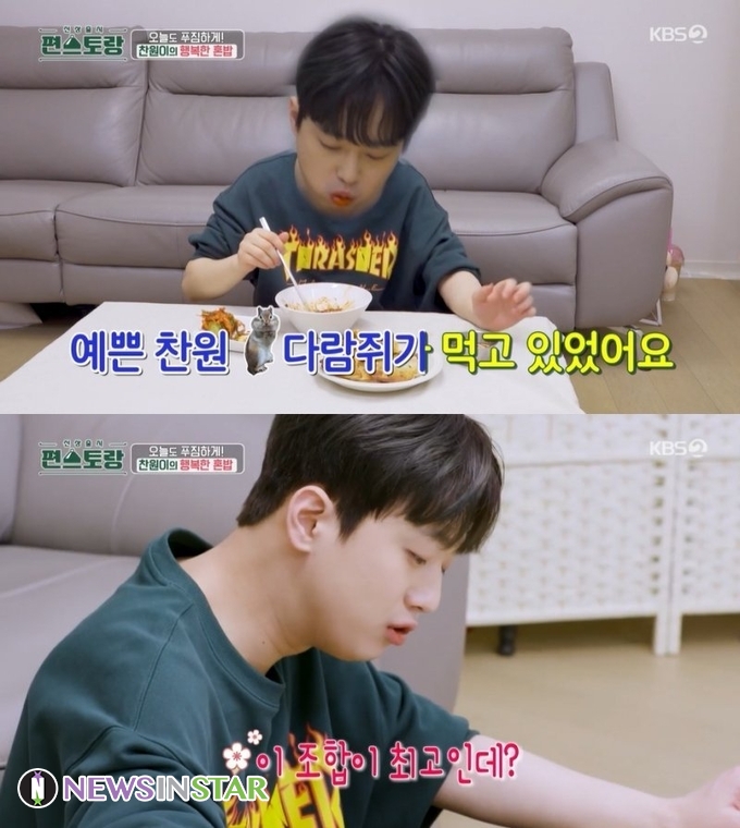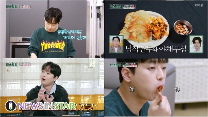 그중에서도 눈길을 끈 것은 집에서 뚝딱 완성한 납작만두. 이찬원은 만두피에 직접 양념한 당면과 부추를 아주 조금 넣고 만든 납작만두를 5개씩 겹쳐서 기름에 튀기듯 익혔다. 여기에 납작만두와 찰떡 궁합을 자랑하는 채소 무침을 곁들였다. 그렇게 이찬원만의 행복한 혼밥 한 상이 완성됐다.