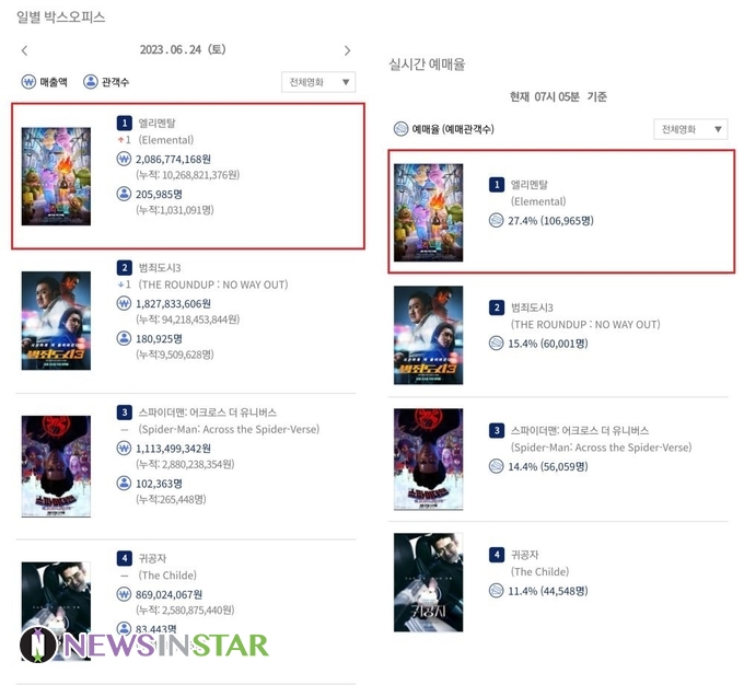 디즈니·픽사 영화 <엘리멘탈 >이 바로 어제(24일) 극장가 쟁쟁한 화제작과 신작들을 뛰어넘고 전체 박스오피스 1위를 기록했다. 개봉과 동시에 동시기 박스오피스 1위, 6월 개봉작 중 박스오피스 1위를 수성하며 흥행 역주행을 일으키고 있는 <엘리멘탈>은 마침내 전체 박스오피스 1위에 등극하며 극장가 최고 흥행 신드롬의 주역임을 입증했다.