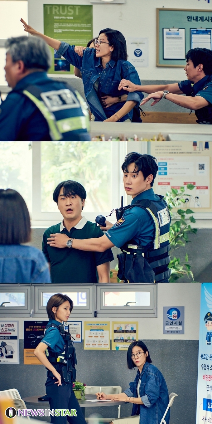 이어진 사진 속 상대 남성은 억울한 듯 울분을 터뜨리며 김은미의 심기를 자극하고 있다. 무슨 까닭인지 만신창이가 된 은재원이 급히 남성을 제지하는 장면도 포착된다. 마지막 사진에서 조서를 작성하는 김은미 곁을 김진희가 든든하게 지키고 있다. 그러면서도 상대 남성을 향한 날카로운 눈빛은 거두지 않아 그 듬직한 면모는 배가되어 느껴진다.