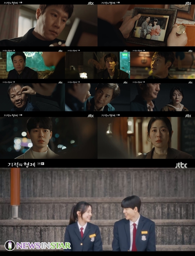 한편, 또 한 명의 인물이 강산의 타임슬립을 알게 됐다. 바로 27년 전 첫 사랑 채우정(강말금)이었다. 이전날 본인이 이강산이며, 자신이 알던 세상은 다 사라졌다고 극심한 고통을 호소했던 강산은 우정을 다시 찾아갔다. 그리고 자신도 모른 채 27년이 지났다며, 실종된 형 하늘의 소식을 물었다. “밀레니엄 사진 같이 찍기로 한 약속 못 지켜서 미안하다”는 사과도 함께였다. 우정이 알고 있는 고등학교 때 첫사랑, 바로 그 강산이었다. 어느 날 갑자기 사라진 강산을 가슴 속 깊이 간직해왔던 우정. “너 정말 강산이니”라는 그녀의 눈엔 복잡 미묘한 감정이 서리며 눈물이 고였다. 시간을 거슬러 다시 만난 강산과 우정의 애틋한 재회 엔딩이었다. ‘기적의 형제’는 매주 수, 목 밤 10시 30분 JTBC에서 방송된다.