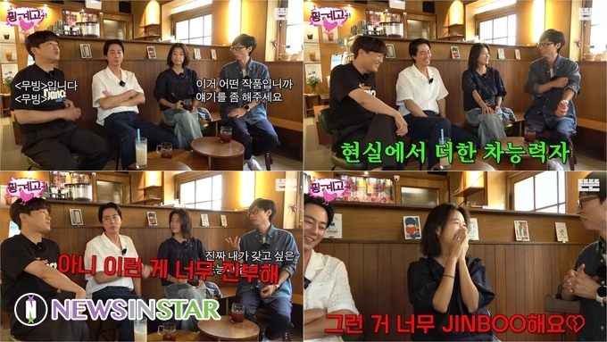 세 사람은 오는 8월 9일 공개를 앞두고 있는 < 무빙>에서 각자 자신이 맡은 캐릭터들을 소개했다. 비행 능력, 초인적인 오감 능력, 전기 능력 등 흥미로운 초능력을 소개하는 도중 유재석은 차태현을 향해 “실제 생활에서도 큰 능력이 있다”며 모사, 없던 싸움 일으키기, 분란 등 예능 쪽으로 실제 생활에서도 큰 능력이 있다고 장난스레 말했고, 조인성 역시 옆에서 “이간질도 한다”며 거들어 큰 웃음을 안겼다.