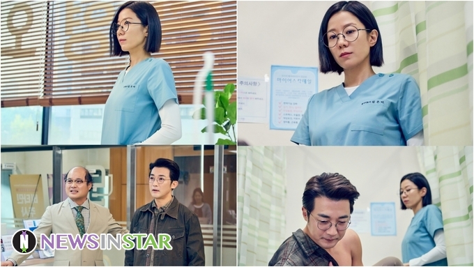 그런가 하면 이어진 사진 속 김은미와 박진홍의 케미가 벌써부터 빵 터지는 웃음을 유발한다. 차디찬 표정의 김은미 앞으로 물리치료를 받기 위해 박진홍이 엎드려 있다. 한쪽 어깨를 드러낸 박진홍이 어쩐지 멋쩍은 웃음을 짓고 있어 애처로운 분위기마저 자아낸다.