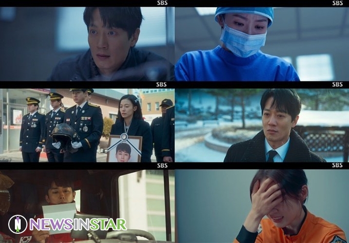 이날 방송에서는 연쇄방화범을 잡기 위해 목숨을 희생한 봉도진(손호준)의 이야기와 봉도진의 희생 이후 더욱더 똘똘 뭉친 소방, 경찰, 국과수의 합동수사 내용이 담겼다. 먼저 병원에서 송설(공승연)에게 반지를 주며 마음을 고백했던 봉도진의 장면은 결국 환상이었음이 공개된 상황. 환상 속에서 봉도진은 송설에게 “미안해. 꼭 살아서 퇴근한다고 약속했는데”라며 눈물을 흘렸고, 그 순간 ‘마중 자재창고’에 있던 사체가 봉도진임이 드러나자 소방과 경찰은 모두 슬픔에 빠졌다. 송설 역시 의식이 돌아오지 않아 참혹함을 더한 가운데 진호개(김래원)는 ‘무영 지하상가’와 ‘마중 자재창고’의 화재신고가 오후 1시 30분으로 동일한 것에 집중하며 ‘동시방화’를 주장했고, 희생자 프로파일링부터 수사를 원점에서 재시작해야 한다고 얘기했다. 그러자 봉도진이 출동 당시 썼던 물품들을 가지고 돌아온 봉안나(지우)는 호흡기에 공기가 남은 것에 의문을 품었고, 최기수(정진우)는 봉도진이 별모양 화염을 봤다고 전했다. 이를 들은 전호개는 단순한 사고사가 아닐 가능성이 높다고 했고, 타살의 가능성을 확인하기 위해 봉도진의 시신은 국과수로 이송됐다.