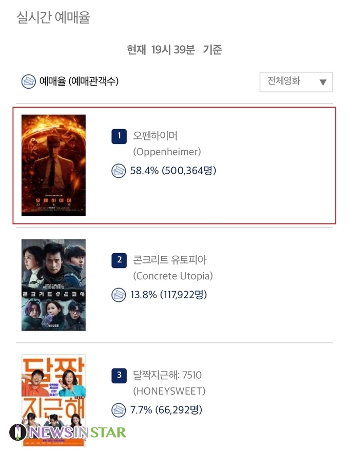 글로벌 흥행 수익 6억 달러 돌파 & 전 세계 49개국 크리스토퍼 놀란 감독 역대 최고 흥행작 경신 등 폭발적인 흥행 신드롬을 이어가고 있는 영화 <오펜하이머>가 국내 개봉을 하루 앞두고 사전 예매 50만 장 돌파라는 또 한 번의 놀라운 기록을 세웠다. 영화진흥위원회 통합전산망에 따르면 <오펜하이머 >는 8/14(월) 오후 7시 39분 기준 전체 예매율 58%, 사전 예매 500,364장을 기록한데 이어 예매율 2위를 기록하고 있는 <콘크리트 유토피아>의 예매량(117,922장)과 4배 넘는 차이를 보이고 있다. 이는 올해 개봉한 외화 중 유일한 기록이자 국내 작품을 통틀어서도 천만 관객을 동원한 <범죄도시3>에 이은 두 번째 기록으로 작품에 대한 뜨거운 관심을 짐작케한다. 특히 최근 외화 블록버스터가 사전 예매량 50만 장을 넘는 경우는 <아바타: 물의 길>, < 쥬라기 월드: 도미니언>, <닥터 스트레인지: 대혼돈의 멀티버스> 등 기존에 두터운 팬층을 보유한 프랜차이즈 작품인 경우가 대다수였던 만큼 이번 < 오펜하이머>의 기록이 더욱 특별하게 다가온다.