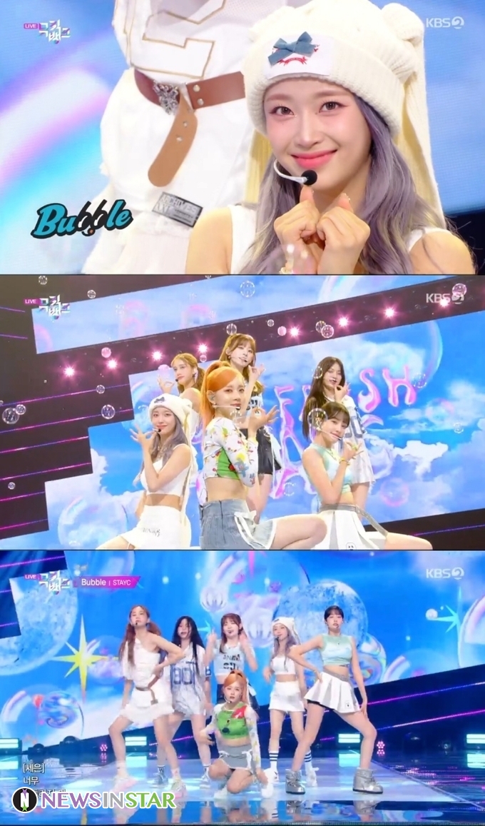 스포티한 매력이 느껴지는 스타일링으로 무대에 오른 스테이씨는 밝은 멜로디로 청량감을, 긍정적인 가사로 기분 좋은 에너지를 선사하며 완성도 높은 무대를 꾸몄다. 특히 스테이씨의 무대는 축제를 연상시키는 신나는 분위기와 발랄함이 가득했다. 마치 동화 속의 한 장면을 옮겨 놓은 듯한 무대 구성이 보는 이들의 시간을 순간 삭제했다. 비눗방울을 부는 듯한 퍼포먼스, 비눗방울을 터뜨리는 퍼포먼스에 다양한 표정 연기가 더해져 강한 중독성을 유발했다.