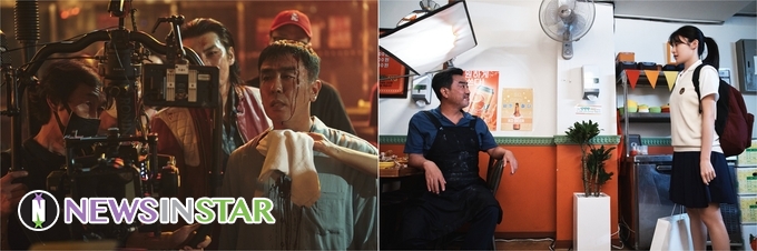 먼저 무한 재생 능력으로 분한 ‘장주원’을 연기한 류승룡은 그 누구보다 거친 액션을 소화하며 날카로운 눈으로 모니터를 체크, 그의 모든 장면이 리얼했던 이유를 납득시키는 컷이 눈길을 사로잡는다. 피 분장이 흐르는 것도 모를 정도로 모니터링에 열중하고 있는 그의 모습은 “류승룡이 아닌 ‘장주원’은 상상하기 힘들다”는 호평을 받고 있는 이유를 짐작하게 만든다. 이와 반대로 치킨집에서 딸 ‘희수’를 사랑스럽게 바라보는 류승룡은 카메라 바깥에서도 두 눈에서 꿀이 떨어지는 눈빛을 장착하고 있어 앞으로 보여줄 ‘장주원’과 ‘장희수’의 부녀 케미를 기대하게 만든다.