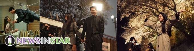 ‘두식미현’이라는 키워드로 소셜미디어 X의 실시간 트렌드에 오르며 화제를 모은 한효주와 조인성의 비하인드 스틸도 이목을 집중시킨다. 마치 실제 ‘이미현’과 ‘김두식’이 된 것처럼 환히 웃고 있는 두 사람의 설레는 모습은 더욱 과몰입을 불러일으킨다. 뜨거운 화제를 모았던 공중부양 키스신 현장부터 벚꽃 데이트 촬영의 생생한 현장들까지 공개되어 특별함을 더한다.