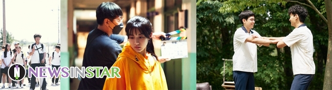 다음으로 1-7회를 책임지며 글로벌 시청자들의 마음을 사로잡은 ‘봉희강’ 트리오의 비하인드 모습이 공개되어 이들을 기다리던 팬들에게 반가움을 전한다. 먼저, 지각 위기를 모면하기 위해 정문을 향해 뛰어가는 장면에서 다른 학생 역할 배우들과 대기하며 해맑게 웃고 있는 이정하의 모습부터 노란 우비를 입고 있어도 청순미를 감출 수 없는 고윤정의 모습 그리고 살벌한 대결을 펼쳤던 ‘기수’ 역의 배우 신재휘와 장난을 치며 모범생 ‘강훈’과 또 다른 매력을 보여주는 김도훈까지 보는 것만으로도 미소를 짓게 하는 정원고 3인방의 모습은 다시 이들이 등장할 다음 에피소드를 더욱 기대하게 한다.