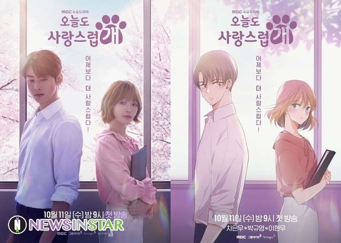 오는 10월 11일(수) 밤 9시 첫 방송 예정인 MBC 새 수요드라마 ‘오늘도 사랑스럽개’(연출 김대웅/ 극본 백인아/ 제작 그룹에이트, 판타지오/ 제작 투자 에이앤이 코리아) 측은 원작 네이버웹툰 캐릭터와 착붙 싱크로율을 자랑하는 차은우(진서원 역)와 박규영(한해나 역)의 메인 포스터를 공개, 안방극장의 설렘 지수를 최고치로 끌어올렸다.