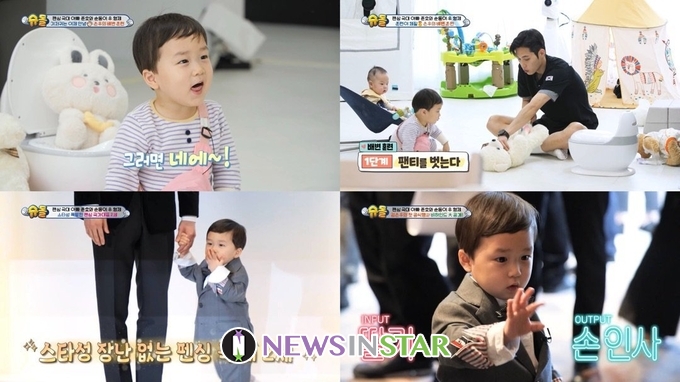 이날 김준호는 싱크홀 착시 매트를 놓고 은우의 반응을 살폈다. 은우는 먼저 휴지를 떨어뜨리며 안전 테스트를 거친 후 조심스럽게 매트를 넘는 똑쟁이 면모로 시선을 사로잡았다. 이어 은우는 동생 바라기 면모를 뽐내 듬직한 모습도 뽐냈다. 은우는 7개월 동생 정우가 울자 “맘마”라고 외치며 의젓하게 동생을 달랬고, 그 모습이 흐뭇했던 김준호는 “은우야 동생 한 명 더 낳을까?”라고 제안했다. 하지만 은우는 “끝. 끝”이라고 대답해 웃음을 선사했다. 이어 은우는 아빠 김준호의 배변 교육을 받으며 기저귀와 이별을 고했다. 김준호가 내는 문제에 자신 있게 손을 들며 열혈 수강생으로 변신한 은우는 변기를 내리는 법까지 마스터하며 어엿한 형아로 거듭나 한 단계씩 성장하는 모습으로 기특함을 안겼다. 김준호는 은우 맞춤형 박스 화장실을 선물했고, 은우는 유성 매직을 들고 화장실 꾸미기를 했다. 김준호는 혹시 은우가 바닥에 낙서를 할까 노심초사하며 “여기만 칠해야 해. 집은 아빠 꺼야”라며 25개월 은우에게 조기 명의 교육으로 폭소를 유발하기도 했다.