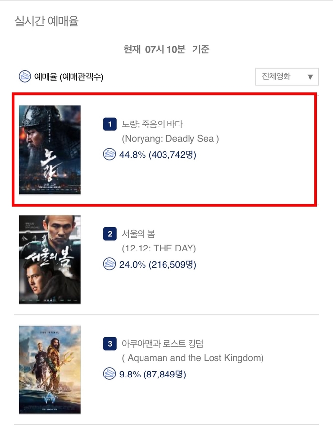 연일 박스오피스를 강타하며 폭발적인 사랑을 받고 있는 영화 <노량: 죽음의 바다>가 크리스마스 연휴를 앞두고 예매량도 진격의 상승세를 보이고 있다. 영화진흥위원회 통합전산망에 따르면 <노량: 죽음의 바다>는 12월 21일(목) 저녁부터 예매량 40만장을 돌파하며 뜨거운 입소문을 입증 중이다.