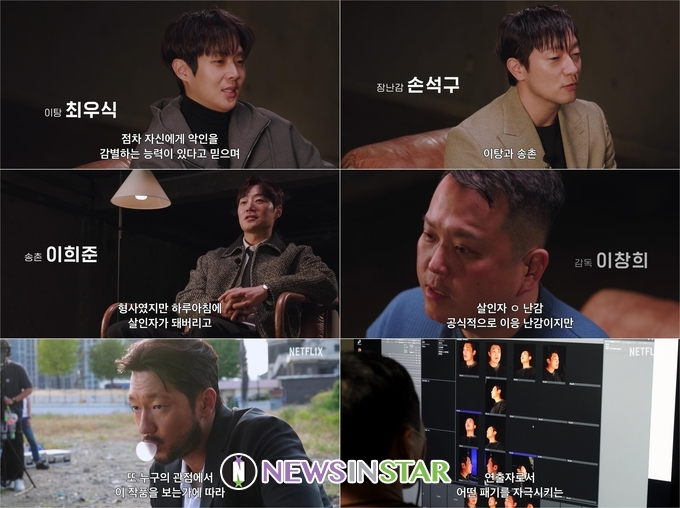 우연히 살인을 시작하게 된 평범한 남자와 그를 지독하게 쫓는 형사의 이야기를 그린 넷플릭스 시리즈 <살인자ㅇ난감> 배우 최우식, 손석구, 이희준과 이창희 감독이 제작기 영상을 통해 작품에 대한 자신감을 드러냈다.