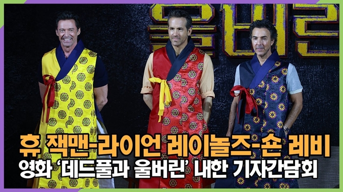 [뉴스인스타 양철수기자] 7월 4일(목) 오전, 서울시 종로구 당주동 포시즌스 호텔 서울에서 영화 ‘데드풀과 울버린’ 내한 기자간담회가 열려 배우 휴 잭맨, 라이언 레이놀즈, 감독 숀 레비가 참석해 기자 간담회를 마치고 한복 선물을 받고 있다.