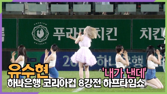 7월 17일(수) 오후, 경기도 김포시 마산동 솔터축구장에서 김포FC-제주Utd의 '2024 하나은행 코리아컵' 8강 경기가 열려 트로트 가수 유수현이 하프타임에 '내가 낸데' 공연을 펼치고 있다.