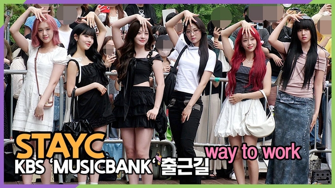 [뉴스인스타 양철수기자] 7월 19일(금) 오전, 서울시 영등포구 여의도 KBS 신관 TV공개홀에서 진행되는 KBS '뮤직뱅크' 생방송 리허설을 위해 그룹 스테이씨(STAYC) 수민, 시은, 아이사, 세은, 윤, 재이가 방송국에 도착해 포즈를 취하고 있다.