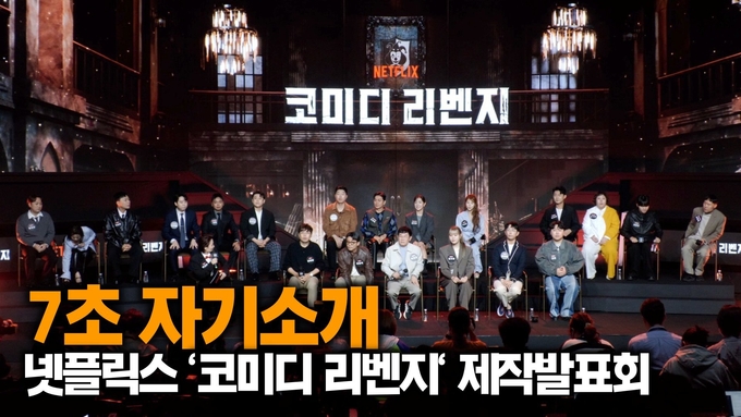 [뉴스인스타 양철수기자] 10월 14일(월) 오전, 서울시 중구 을지로 동대문 브이스페이스에서 넷플릭스 예능 '코미디 리벤지' 제작발표회가 열려 출연자 이경규팀(이경규, 이창호, 엄지윤, 조훈) 펀치라인(이용진, 신기루, 신규진) 집사와 아가씨(김경욱, 김지유, 송하빈) 잔나비정상(곽범, 이선민, 이재율) 산딸기(박나래, 황제성, 이상준) 등촌동 레이커스(김용명), 헬로길티(박세미)가 참석해 7초간 자기소개를 하고 있다.