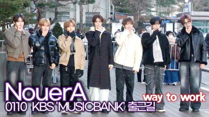 [뉴스인스타 양철수기자] 1월 10일(금) 오전, 서울시 영등포구 여의도 KBS신관 TV공개홀에서 생방송으로 진행되는 KBS '뮤직뱅크' 리허설을 위해 그룹 누에라(NouerA) 기현, 준표, 현준, 유섭, 린, 판, 미라쿠가 방송국에 도착해 포즈를 취하고 있다.