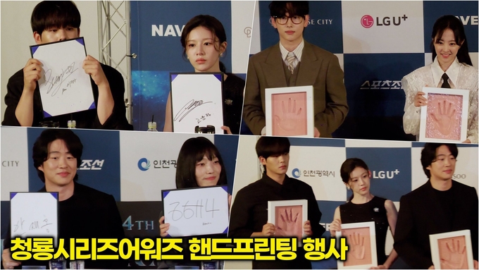 [뉴스인스타 양철수기자] 6월 25일(수) 오전, 서울시 영등포구 여의도 CGV 여의도점에서 제4회 청룡시리즈어워즈 핸드프린팅 행사가 열려 이정하-고윤정-안재홍-금해나-임시완-박보영-신동엽-장도연-곽준빈이 참석해 사인과 핸드프린팅을 진행하고 있다.