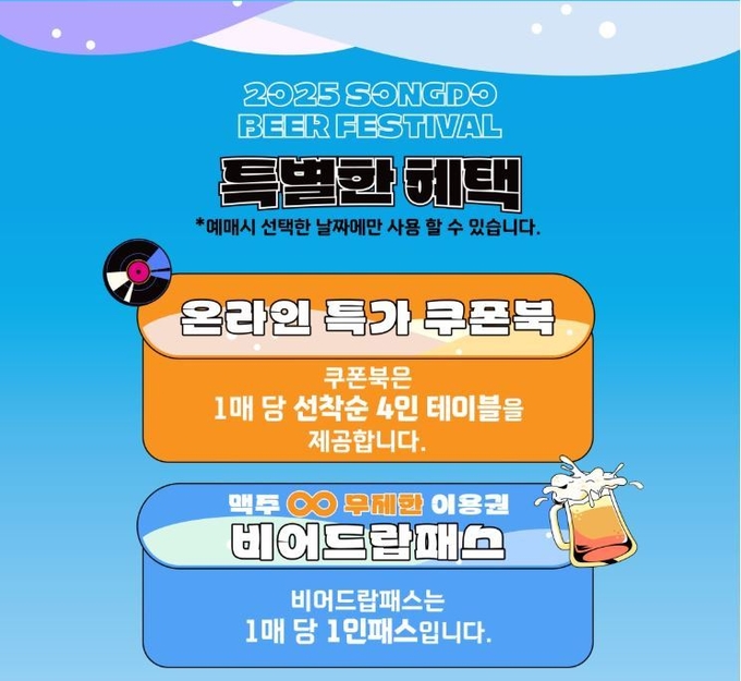 이 밖에도 ㈜맥가이버팩토리가 기획·제작한 물총 축제 '송도크란', 공포체험존 등 다양한 체험형 콘텐츠가 마련되어 있으며, 현재 티켓링크에서는 맥주를 무제한으로 즐길 수 있는 ‘비어드롭 패스권’과 축제를 보다 풍성하게 즐길 수 있는 스페셜 쿠폰북이 판매 중이다.