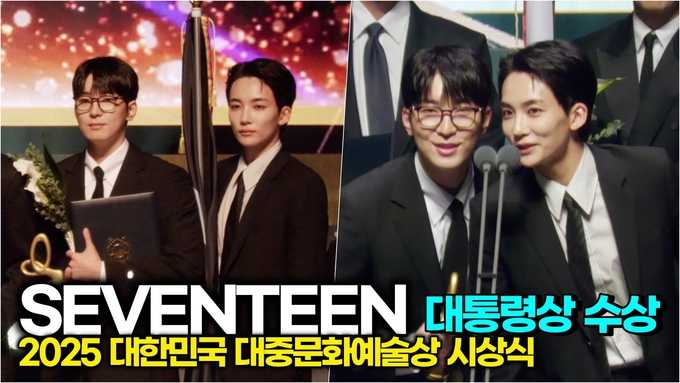 이날 시상식에서 대통령표창 수상자인 세븐틴의 정한 원우가 수상을 하고 있다.
