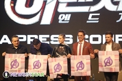 15일 오전 서울시 종로구 포시즌스 호텔 서울에서 영화 '어벤져스: 엔드게임(Avengers : Endgame)' 내한 프레스 컨퍼런스가 열려 루소 형제 감독, 브리 라슨, 로버트 다우니 주니어, 제레미 레너가 참석해 한국의 기념품을 받고 포토타임을 갖고 있다. 이번 아시아 프레스 컨퍼런스에는 아이언맨 로버트 다우니 주니어, 캡틴 마블 브리 라슨, 호크아이 제레미 레너, 루소 형제 감독, 마블의 수장 케빈 파이기 등이 참석했다. 한편 '어벤저스 : 엔드게임'은 인피니티 워 이후, 지구의 마지막 희망을 위해 살아남은 어벤져스 조합과 빌런 타노스의 최강 전투를 그린 영화로 24일 한국에서 전 세계 최초로 개봉한다.