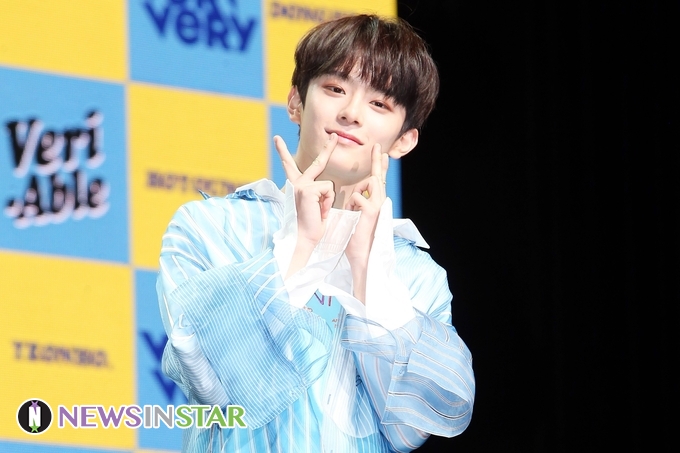 24일 오전 서울시 광진구 광장동 예스24 라이브홀에서 보이그룹 '베리베리(VERIVERY)의 두 번째 미니 앨범 ‘VERI-ABLE(베리어블)’ 쇼케이스가 열려 강민이 포토월에서 포즈를 취하고 있다.
