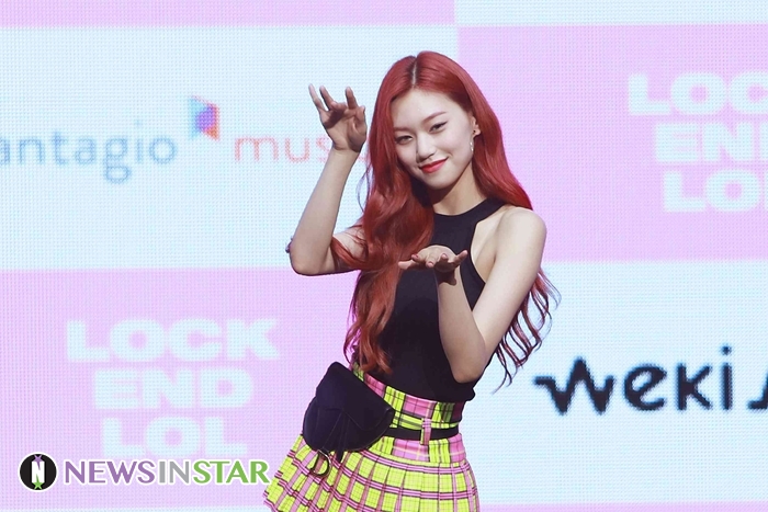 14일 오후 서울시 용산구 한남동 블루스퀘어에서 위키미키(Weki Meki)의 두 번째 싱글 앨범 'LOCK END LOL(락앤롤)' 발매 기념 기자 쇼케이스가 열려  김도연이 포토타임을 갖고 있다.