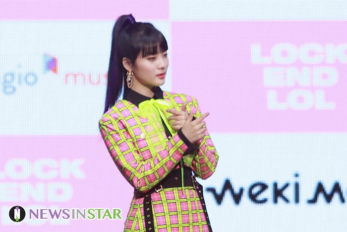 14일 오후 서울시 용산구 한남동 블루스퀘어에서 위키미키(Weki Meki)의 두 번째 싱글 앨범 'LOCK END LOL(락앤롤)' 발매 기념 기자 쇼케이스가 열려  루시가 포토타임을 갖고 있다.
