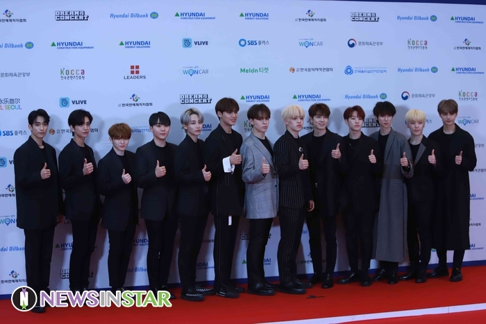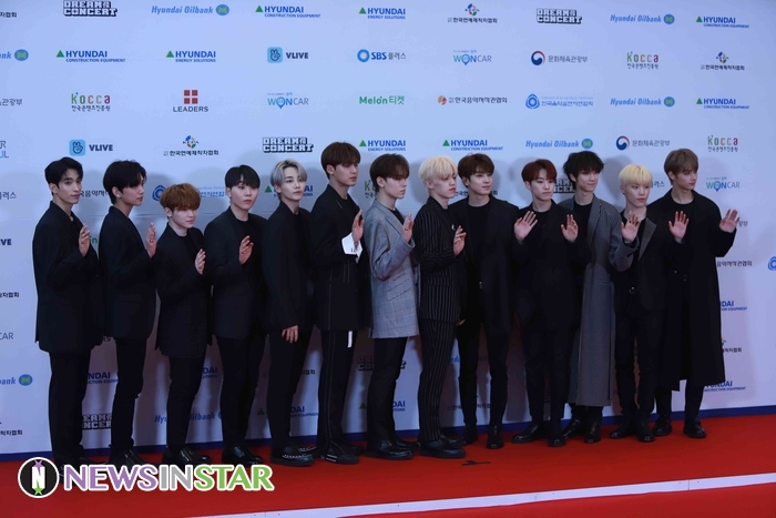 18일 오후 서울시 마포구 월드컵로 서울월드컵경기장에서 '제 25회 2019 드림콘서트'의 레드카펫 포토월 행사가 진행돼 세븐틴이 포토타임을 갖고 있다.