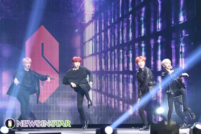 22일 서울시 송파구 방이동 올림픽공원 올림픽홀에서 보이그룹 AB6IX(임영민X김동현X이대휘X박우진X전웅)의 데뷔앨범 ‘B:COMPLETE’ 발매 기념 쇼케이스가 열려 수록곡 'ABSOLUTE'의 열정적인 무대를 펼치고 있다.