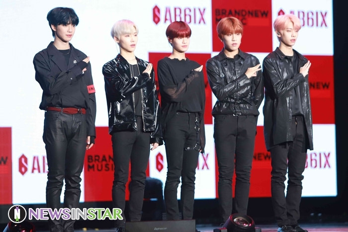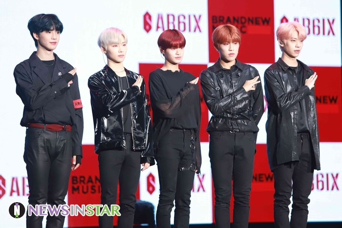 22일 서울시 송파구 방이동 올림픽공원 올림픽홀에서 보이그룹 AB6IX(임영민X김동현X이대휘X박우진X전웅)의 데뷔앨범 ‘B:COMPLETE’ 발매 기념 쇼케이스 열려  단체 포토타임을 갖고 있다.