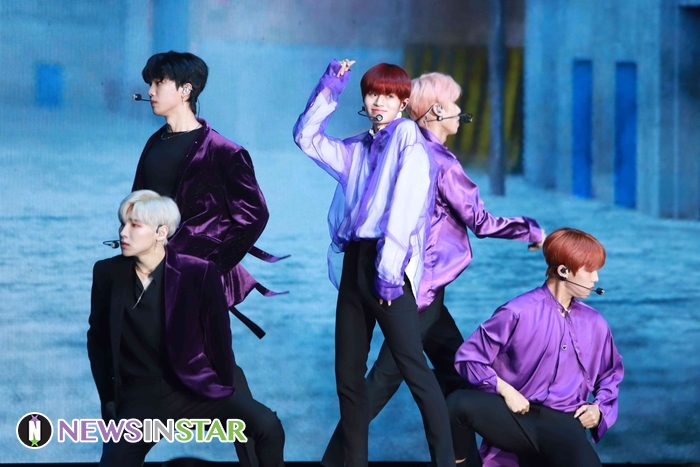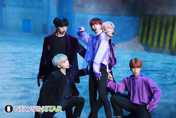 22일 서울시 송파구 방이동 올림픽공원 올림픽홀에서 보이그룹 AB6IX(임영민X김동현X이대휘X박우진X전웅)의 데뷔앨범 ‘B:COMPLETE’ 발매 기념 쇼케이스가 열려 타이틀곡 'BREATHE' 무대를 선보이고 있다.