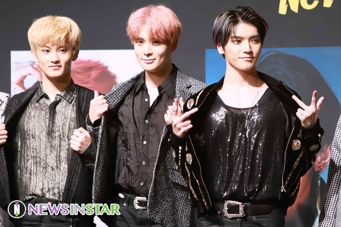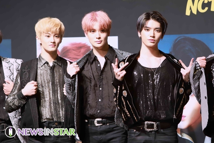 24일 오후 서울시 영등포구 여의도동 콘래드 서울에서 NCT127의 새 앨범 ‘#127 WE ARE SUPERHUMAN’ 제작발표회가 열려 NCT127 마크X재현X태용이 포토타임을 갖고 있다.