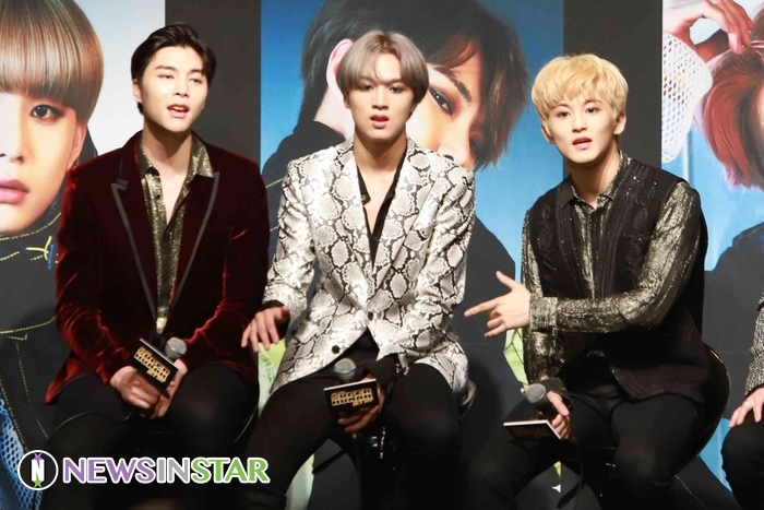 24일 오후 서울시 영등포구 여의도동 콘래드 서울에서 NCT127의 새 앨범 ‘#127 WE ARE SUPERHUMAN’ 제작발표회가 열려 NCT127 쟈니X해찬X마크가 신곡을 듣고 있다.