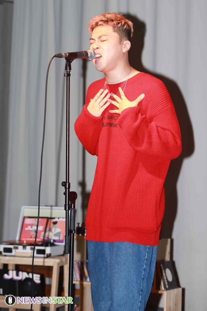 3일 오후 서울시 마포구 서교동 벨로주 홍대에서 가수 준(JUNE)이 정규 1집 'Today's' 발매 쇼케이스를 열어 포토타임에서 포즈를 취하고 있다.