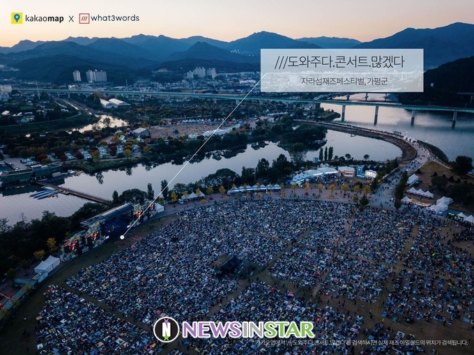 자라섬재즈페스티벌(이하 ‘자라섬재즈’)이 지난 7월 카카오의 모바일 지도 서비스 카카오맵과 상호 협력을 위한 업무 협약을 체결했다. 이를 통해 카카오맵의 정밀 지도 서비스인 세 단어 주소(이하 W3W)'를 적극 도입하여 야외 페스티벌에서 가지고 있던 장소 안내의 정보적 한계를 넓히고 관객들에게 다양한 편의 제공에 나선다. 카카오맵의 정밀 지도 서비스 'W3W'는 지번이나 장소명을 기반으로 했던 기존의 지도 서비스와 달리 산/바다 등 국내 어느 위치나 3m 단위로 검색/공유가 가능하다. 이는 국내 야외 페스티벌에서는 불가능했던 정교한 주소 정보 제공에 유용한 서비스로 잔디밭 위 돗자리 주소나, 야외 주차장 이용 시 자세한 주차 위치까지 세 단어의 주소로 표현한다. 자라섬재즈는 국내 페스티벌 최초로 카카오맵과의 서비스 제휴를 통한 원활한 현장 운용과 관객들에게 꼭 필요한 정보 서비스를 제공할 예정이다.