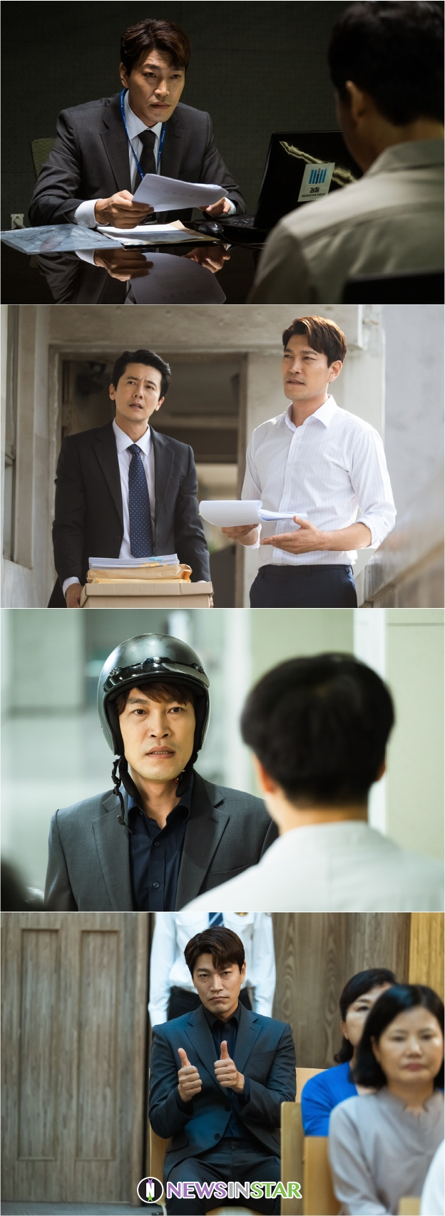 그런 가운데 공개된 사진 속 배홍태는 ‘비인권검사’라는 불명예 타이틀을 지녔던 검사 시절 모습으로 돌아간 듯하다. 날카로운 눈빛으로 거침없이 피의자를 심문하는 배홍태. 여기에 동료 검사와 함께 사건 현장을 누비며 열정을 불태우고 있는 그의 모습이 시선을 사로잡는다. 그런가 하면 조금은 다른 분위기의 헬멧을 쓴 배홍태의 긴박한 표정도 흥미롭다. 사건 해결을 위해서라면 물불 가리지 않고 직진하던 배홍태이기에 그가 절박하게 해결하려고 했던 사건이 무엇일지 기대가 쏠린다. 이어진 사진 속 참관인으로 재판에 참석한 배홍태의 모습도 포착됐다. 재판장 누군가를 향해 엄지척을 날리는 배홍태의 모습이 궁금증을 더욱 유발한다.