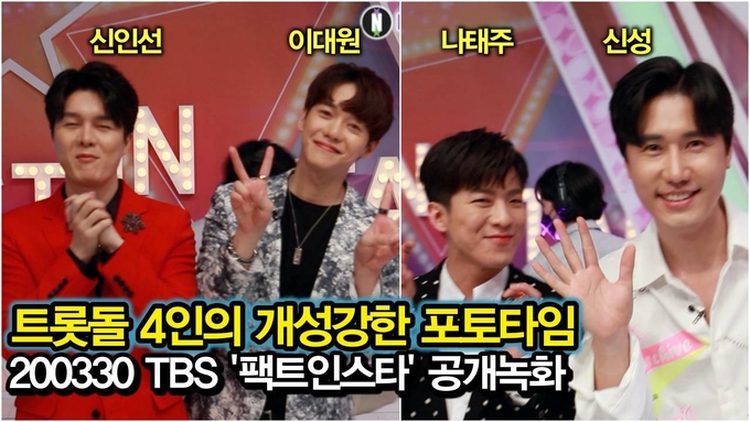 3월 30일 오전 서울시 마포구 상암동 에스플렉스 센터 1층 tbs 오픈스튜디오에서 '팩트인스타(Fact in Star)' 공개녹화가 있어 JTBC ‘내일은 미스터트롯’ 출연자인 트롯돌 신성, 나태주, 신인선 이대원이 출연해 단체 포토타임을 갖고 있다.