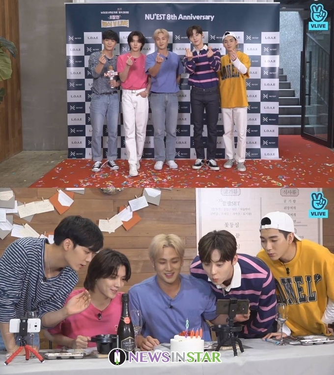 그룹 뉴이스트(JR, 아론, 백호, 민현, 렌)가 데뷔 8주년과 3000일을 축하하는 랜선 회식으로 팬들과 뜻깊은 시간을 보냈다.