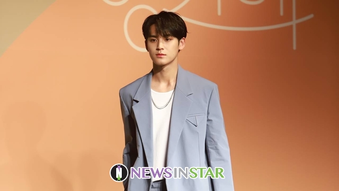 6월 22일(월) 오후 서울시 강남구 삼성동 인터콘티넨탈호텔 서울 코엑스에서 그룹 세븐틴(SEVENTEEN)의 미니 7집 '헹가래(HENGGARAE)'의 쇼케이스가 열려 민규가 포토타임을 갖고 있다.