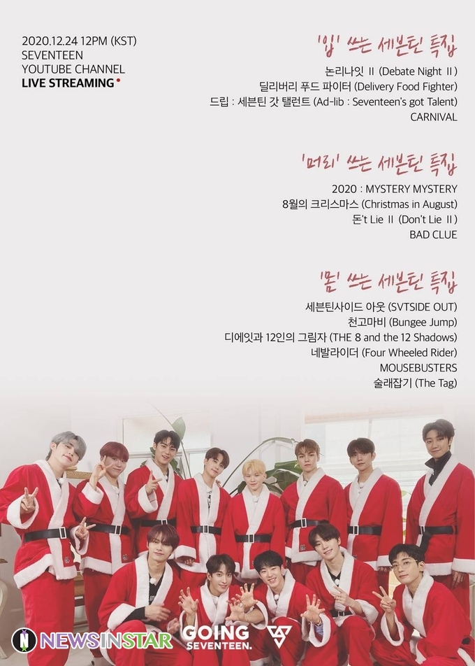 소속사 플레디스 엔터테인먼트는 “크리스마스 이브를 맞아 많은 분들이 사랑해주신 세븐틴 자체 콘텐츠 ‘고잉 세븐틴’의 12시간 라이브 스트리밍을 진행한다. 이번 크리스마스에는 집에서 안전하고 건강하게 세븐틴과 함께 하시기 바란다”고 전했다.