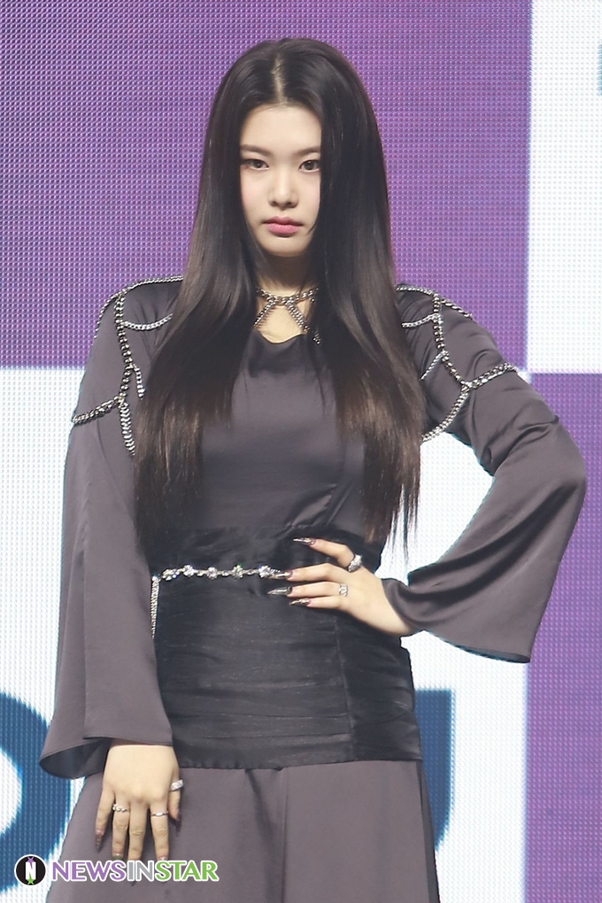 [뉴스인스타 양철수 기자] 3월 15일 오후, 서울시 광진구 광장동 예스24 라이브홀에서 진행된 퍼플키스(PURPLE KISS)의 데뷔 앨범 'INTO VIOLET' 쇼케이스가 열려 퍼플키스(박지은, 나고은, 도시, 이레, 유키, 채인, 수안)의 수안이 포토타임에 포즈를 취하고 있다.