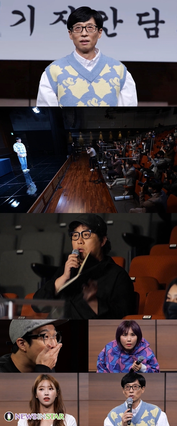 공개된 사진 속에는 수많은 기자들 앞에선 유재석의 모습이 포착돼 시선을 모은다. 유재석은 “예전에 유산슬 활동할 때 한 적이 있는데.. 할 수 있는 한 성심성의껏 질문에 답해드리겠습니다”라며 정중하게 소감을 전했다.
